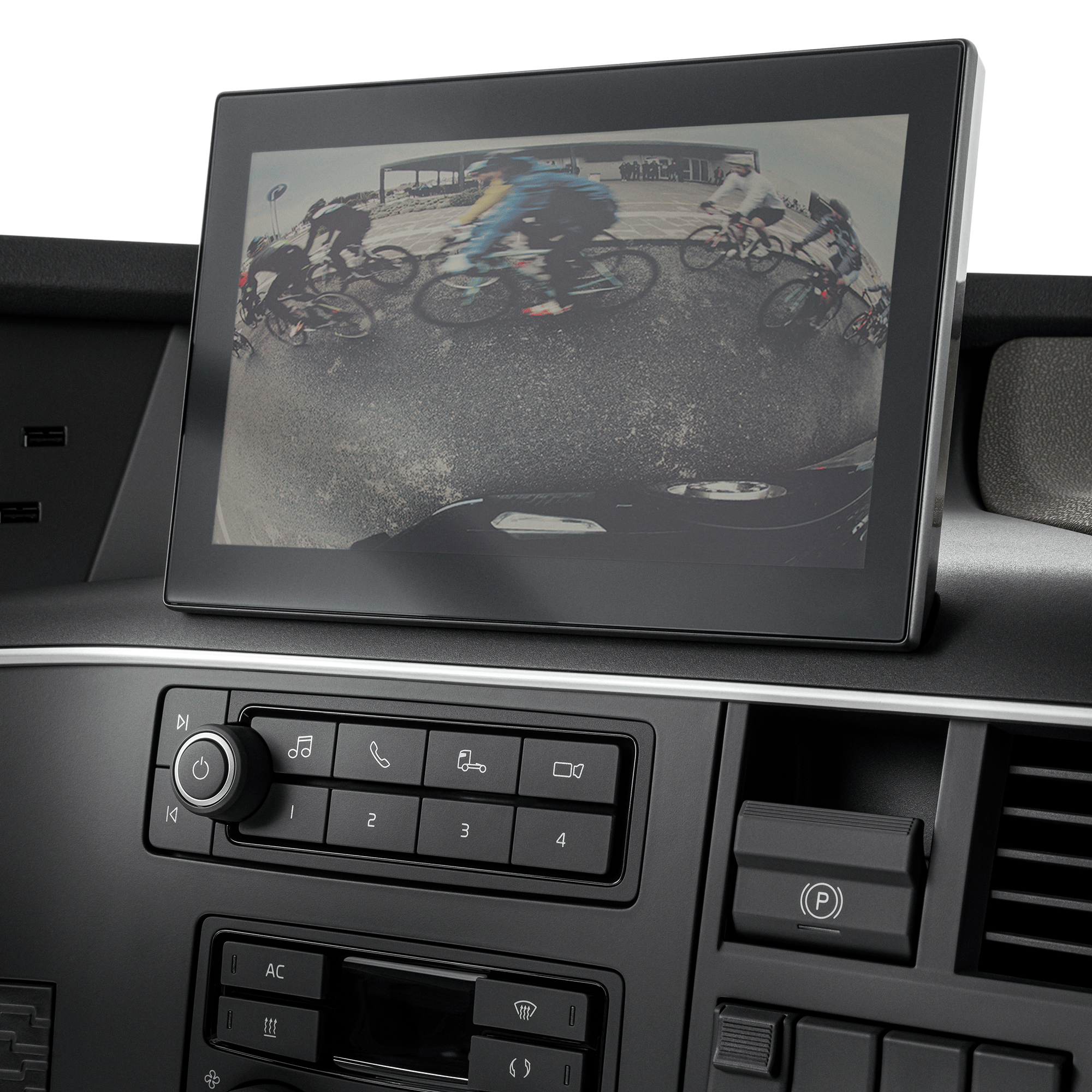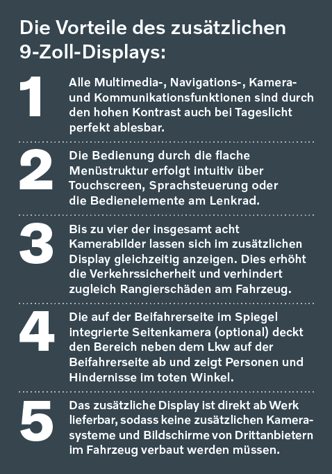 Das zusätzliche Display in der Mitte des Armaturenbretts bietet dem Fahrer zudem die Möglichkeit, sich bis zu acht unterschiedliche Kamerabilder darauf anzeigen zu lassen. Dabei kann der Fahrer zwischen verschiedenen Anzeigeoptionen wählen und sich z.B. bis zu vier der möglichen acht Kamerabilder zeitgleich als Splitscreen anzeigen lassen. Das minimiert die Gefahr von Anfahrschäden beim Rangieren auf engem Raum oder Personenschäden beim Abbiegen. Das zusätzliche Display kann auch mit den Bedienelementen am Lenkrad oder über Sprachsteuerung gesteuert werden.