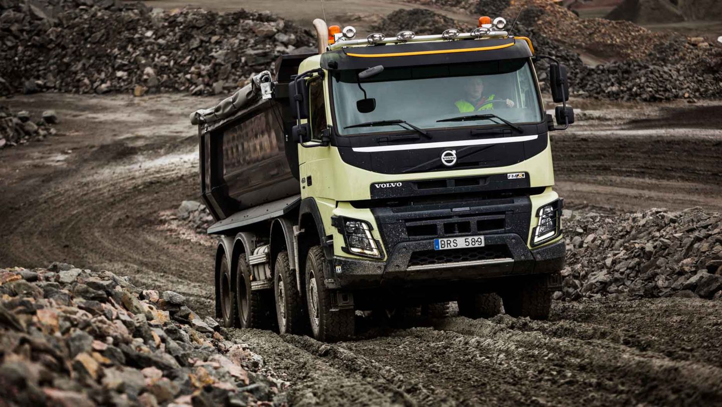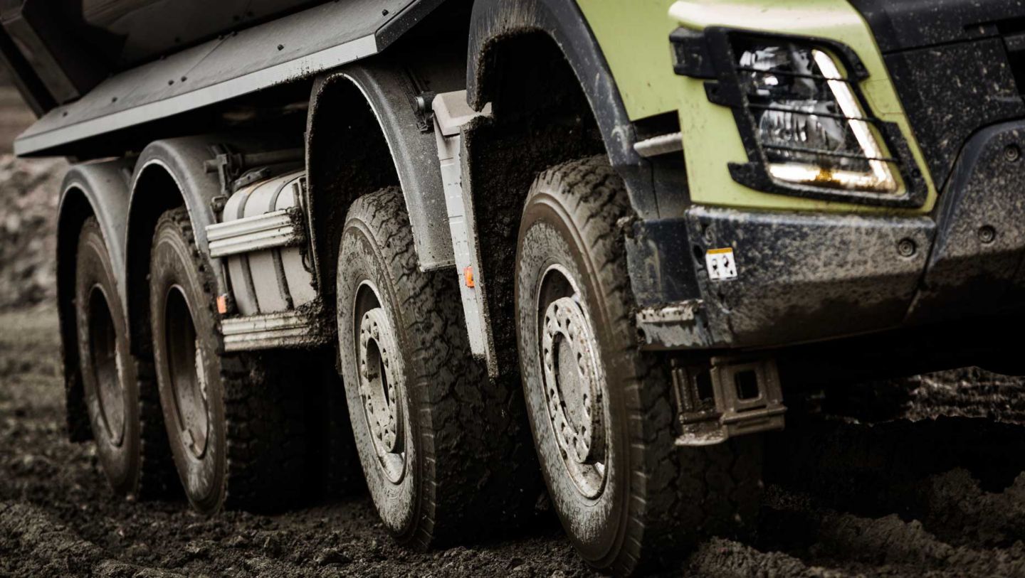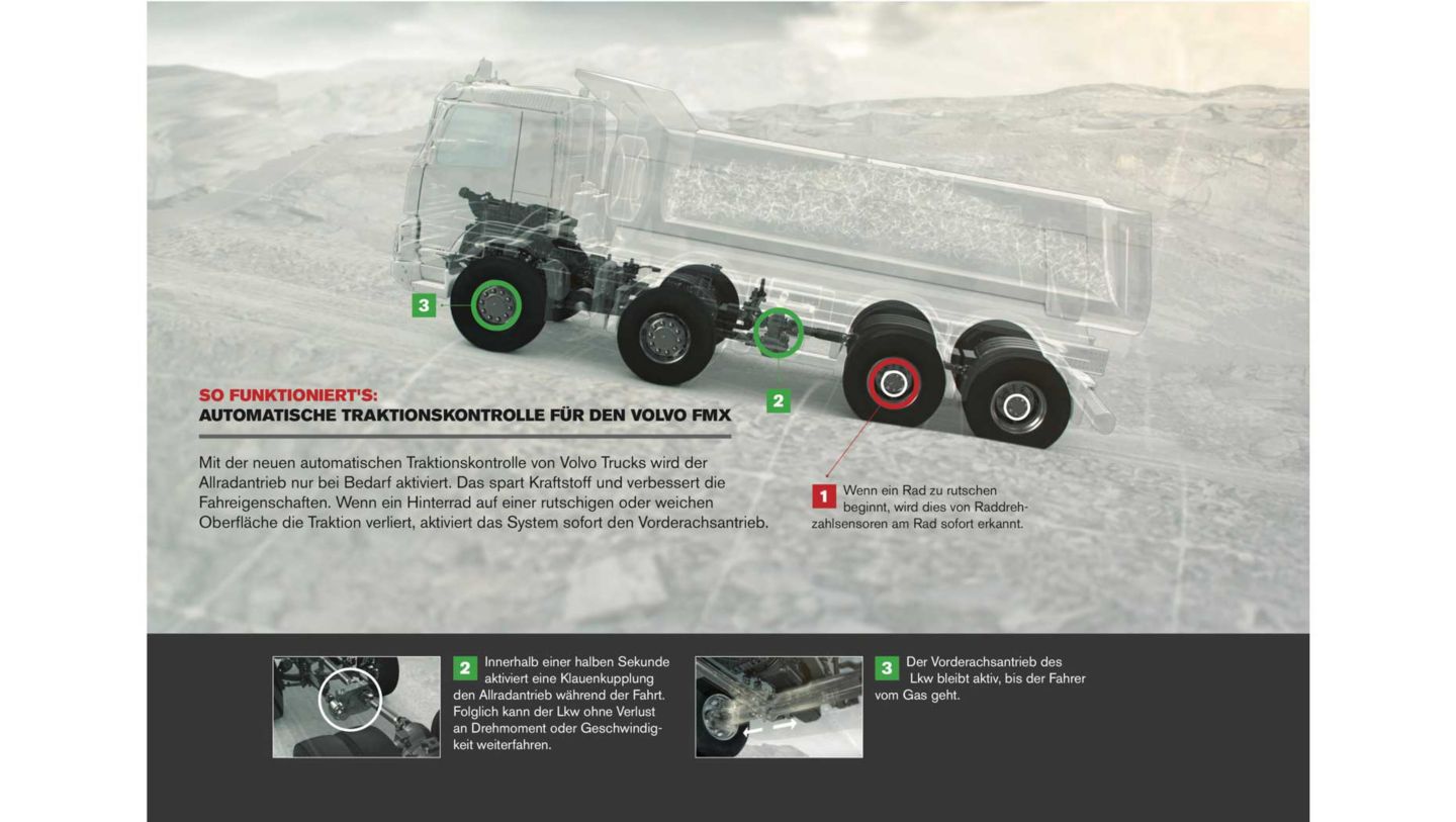 Volvo Trucks ist der erste Lkw-Hersteller der Welt, der bei Baustellenfahrzeugen eine automatische Aktivierung des Allradantriebs anbietet. Der automatische Allradantrieb von Volvo Trucks schaltet den Antrieb an der Vorderachse zu, wenn die Hinterräder auf rutschigem oder weichem Untergrund die Haftung verlieren.