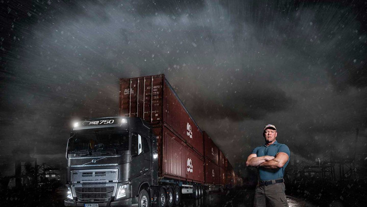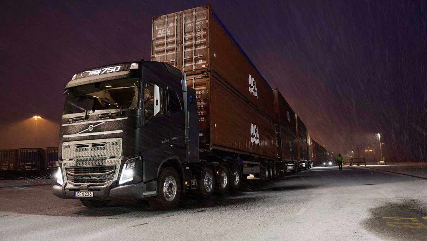 Im Hafen von Göteborg, Schweden, liegen 40 mit Volvo-Ersatzteilen beladene Container auf 20 Anhängern und bilden einen 300 Meter langen Lastzug. Zusammen mit dem Lkw wiegt der Zug 750 Tonnen. Die Aufgabe: Mit einem Volvo FH16 aus dem Stand 750 Tonnen über eine Distanz von 100 Metern ziehen.