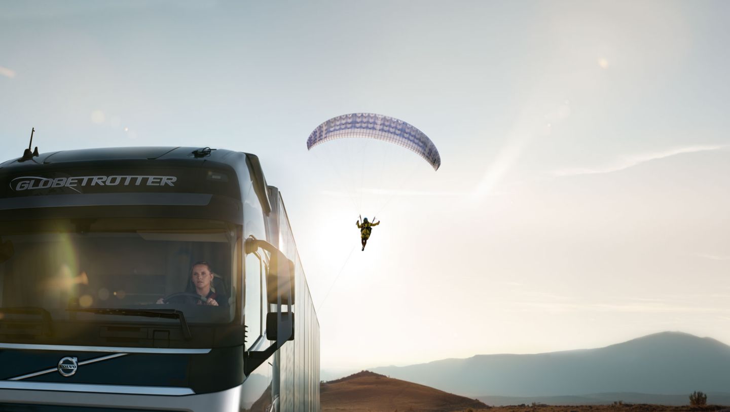 Der einzigartige Antriebsstrang mit I-Shift-Doppelkupplungsgetriebe von Volvo Trucks verspricht hervorragende Fahreigenschaften und behält gleichzeitig einen niedrigen Kraftstoffverbrauch bei. In der neuen Herausforderung von Volvo Trucks wird die Leistungsfähigkeit des Antriebsstrangs auf die Probe gestellt, indem ein Gleitschirm- flieger mit einem Volvo FH verbunden wird. Der Test ist der weltweit erste Stunt dieser Art mit einem Lkw und einem Gleitschirmflieger.