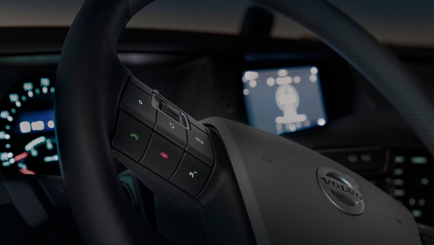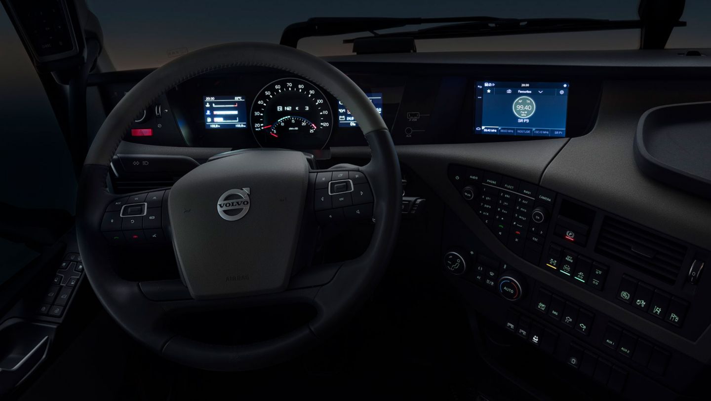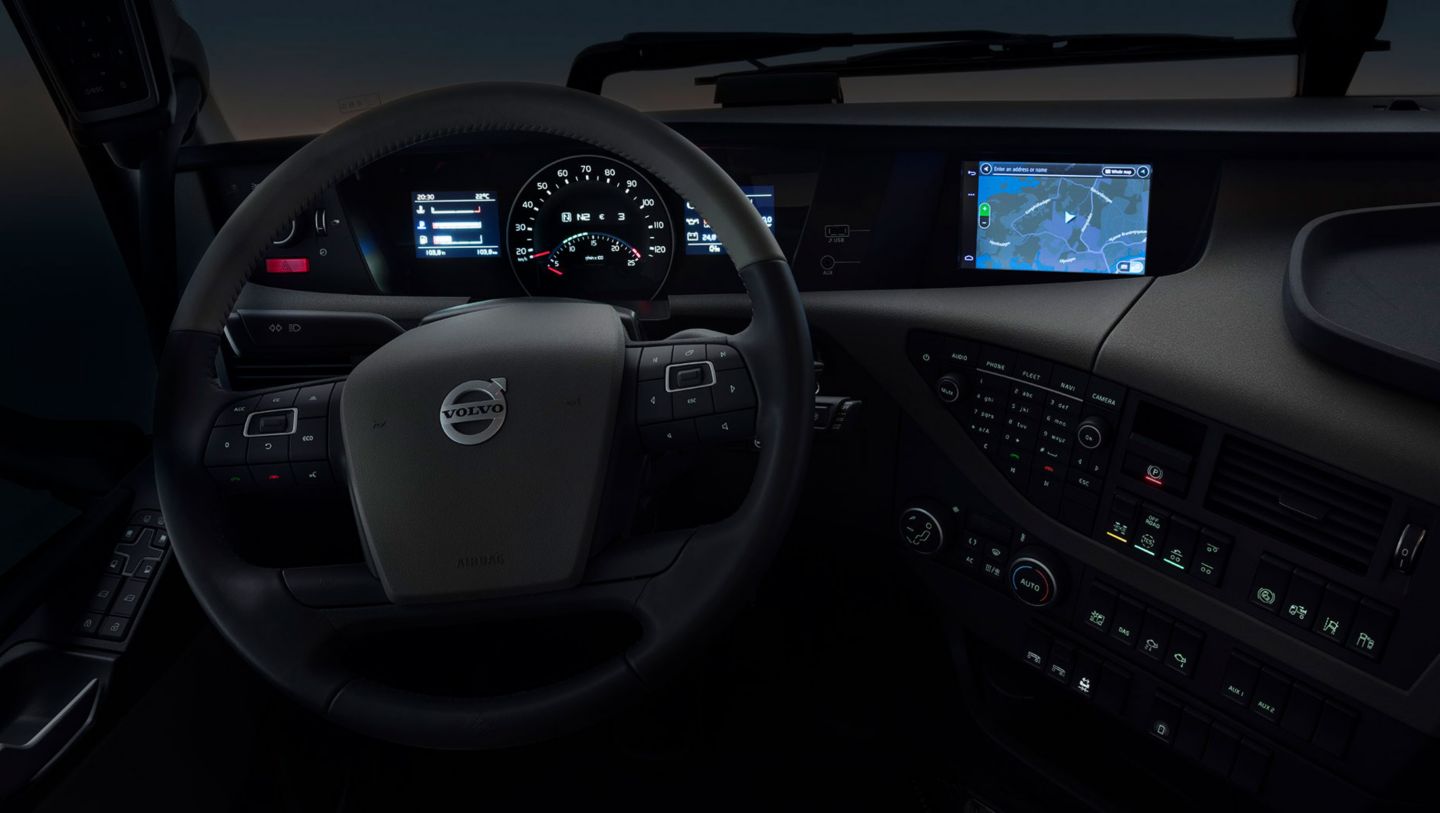 Durch den Zusammenschluss des Audio- und Entertainment-Geräts mit den Navigations- und Fuhrparkmanagementsystemen hat Volvo Trucks ein mühelos bedienbares Komplettsystem geschaffen, das sich per Touchscreen, Sprachbefehl und Lenkradtasten steuern lässt.