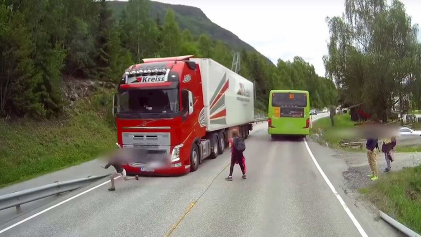 Video Schulkind beinahe von Lkw erfasst.