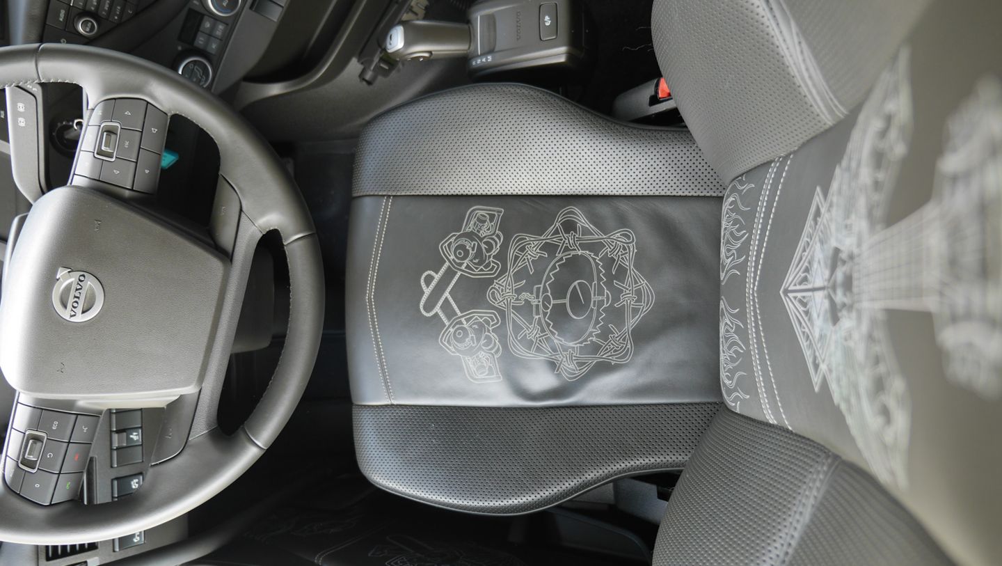 Der Truck weist viele Besonderheiten auf. Die obere Hälfte des Fahrerhauses ist außen mit schwarzem Struktur-Kunstleder verkleidet. Die untere Hälfte ziert ein Metallic-Design, abgebildet sind zahlreiche Kabel. Die Idee dazu lieferte Björn Gelotte - eine Bühne mit Lautsprechern und einem Wirrwarr aus Stromkabeln - die Welt der Rockmusik. Die Innenraumgestaltung des Fahrerhauses vermittelt die Atmosphäre einer Rock Lounge. Auf sämtlichen Türverkleidungen, Sitzen und Vorhängen prangt das