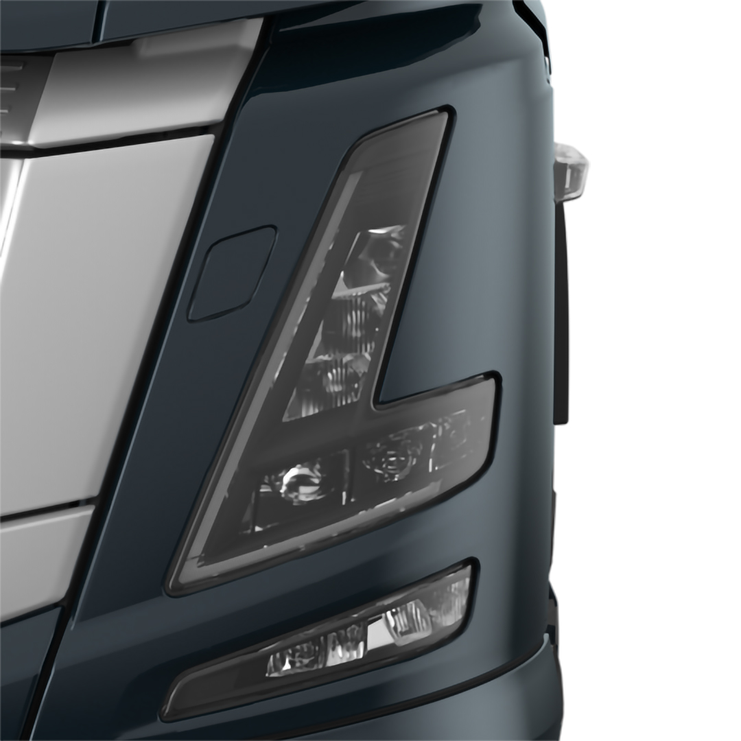 Silbern lackierter Kühlergrill, Spiegelabdeckungen und Sonnenblende. Glänzend verchromte Türgriffe. Schwarze Scheinwerfer. Stoßfänger und Spoiler in Fahrerhausfarbe.